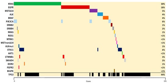 Molecular alterations—EGFR, KRAS, NRAS, BRAF, MET∆ex14, ERBB2, ERBB4, PIK3CA—and gene fusions—ALK, ROS1, RET, NTRK1—were referred to as oncogenic drivers [36,37,38]. Among the aforementioned, mutations at EGFR, BRAF, and MET∆ex14, and gene fusions at ALK, ROS1, RET, and NTRK1 were considered actionable driver genes. Non-driver mutations included those reported in TP53, STK11, CTNNB1, AKT1, SMAD4, DDR2, FGFR2, MAPK, ALK, and METnon∆ex14. Tumours with an unchanged form were referred to as full WT tumours. Patients carrying co-mutations were considered once and categorized by the driver alteration.