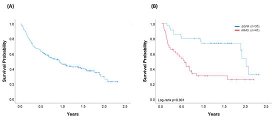 Overall survival (OS). (A) Entire cohort of successfully genotyped patients diagnosed with metastatic disease through April 2019 (n = 156). Median OS (95% CI): 0.93 years (0.63–1.24); (B) Patients harbouring EGFR (n = 35) or KRAS (n = 41) oncogenic driver mutations. For KRAS-mutated patients, 54% received chemotherapy, 12% immunotherapy, and 34% best supportive care. For EGFR-mutated patients, 77% received a matched therapy, 6% chemotherapy, and 17% best supportive care. Median OS (95%CI): EGFR 2.02 years (1.86–2.19); KRAS 0.55 years (0.36–0.74), log-rank p = 0.001. Vertical tick marks are censoring events.