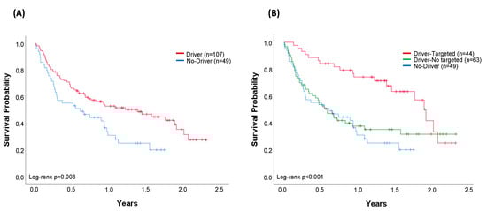 When outcomes were compared in accordance with the treatment received (targeted/no-targeted), the median OS was 1.90 years (95% CI 1.69–2.10) in patients with a driver who received a matched genotype-directed therapy, compared with 0.59 years (95% CI 0.39–0.79) in patients with oncogenic drivers but not amenable to any targeted therapy (log-rank p = 0.002). Outcomes in this latter group are very similar to those from patients in whom no driver was identified (log-rank p = 0.559) (Figure 5B).