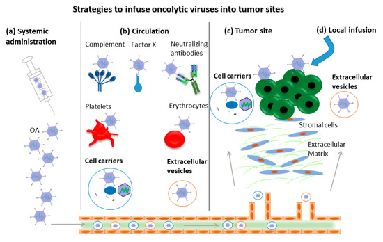 Strategies to overcome potential barriers in delivering oncolytic adenoviruses (OAs) into tumor sites. For systemic administration (a) such as intravenous injection, the complement, neutralizing antibodies, platelets and erythrocytes present in blood circulation bind to OAs (b) and block the migration of OAs into tumor sites. Cell carriers and extracellular-vesicles-delivered OAs escape the above-mentioned barriers to some extent before the OAs reach the tumor site (c). Local infusion represents an alternative strategy to avoid the interaction with blood components (d).