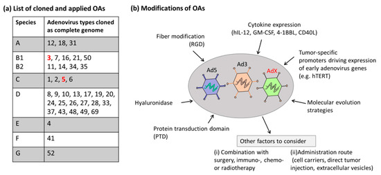 Besides OAs based on Ad5, the most prominent Ad candidate which was converted into OAs is based on Ad type 3 derived from species B viruses. The Ad3-based Ad3-hTERT-E1A vector was developed and showed hints of tumor killing in both tumor patients and animal models [161]. Moreover, a modified version of this OA was generated (Ad3-hTERT-CMV-hCD40L), which was armed with an expression cassette encoding the human immune-stimulatory molecule CD40L for modulation of the tumor microenvironment. The application of this OA resulted in improved function of dendritic cells and direct tumor lysis [162].