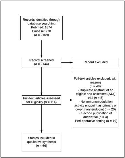 Forty-eight full-text articles were excluded because they reported the following: (1) any immunomodulation activity endpoint as the primary or co-primary endpoint (n = 20, 41.7%); (2) a perioperative setting (n = 19; 39.6%); (3) a duplicate abstract of an eligible trial (n = 5; 10.4%); and (4) second publications of eligible trials (n = 4; 8.3% refer to Figure 1).