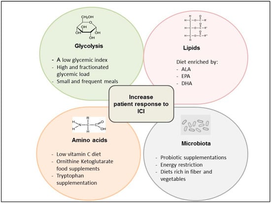 In this perspective, a promising strategy is to investigate the role of modulating specific metabolic pathways in the cells of the immune system and in cancer cells, and in particular to implement both pharmacological and dietary interventions to this aim. This work provides a systematic review on the potential metabolic patterns that affect the immune system functions, and gives an insight into the dietary interventions and possible strategies to improve ICI antitumor efficacy. In particular, we aimed at identifying metabolic pathways that affect the functional status of immune cells in the immune system, as well as metabolic factors that are capable of predicting the antitumor efficacy of currently available immunotherapies.