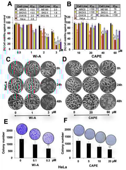 2.1. Wi-A and CAPE Caused Cytotoxicity to Cervical and Ovarian Cancer Cells