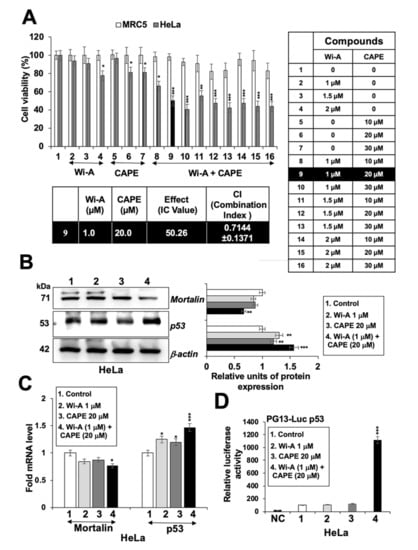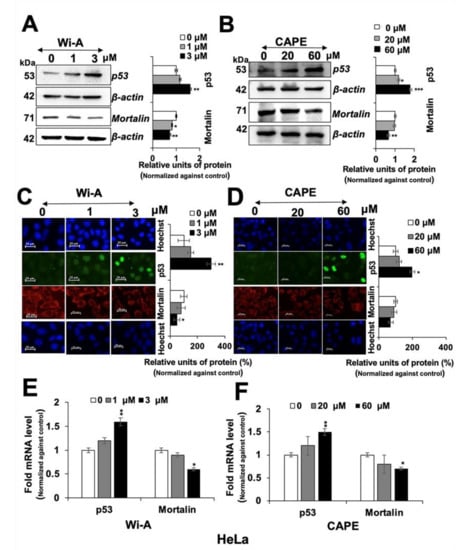 2.2. Wi-A and CAPE Caused Downregulation of Mortalin and Activation of Tumor Suppressor p53 Protein