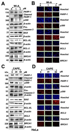 Withaferin A (Wi-A) and caffeic acid phenethyl ester (CAPE) triggered poly ADP-ribose polymerase1 (PARP1) cleavage and apoptosis signaling. Wi-A (A,B) and CAPE (C,D)-treated cells showed decrease in PARP1, p300, pro-caspase 3, B-cell lymphoma 2 (Bcl-2), B-cell lymphoma-extra large (Bcl-xL), and breast cancer type 1 susceptibility protein (BRCA1) as detected by Western blotting (A,C) and immunostaining (B,D); Scale bar-20 μM. Each data set represents the mean ± SD for at least three independent biological replicates.
