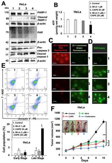 In order to elucidate the mechanism of action further, we hypothesized that a decrease in mortalin may lead to compromised mitochondrial function and oxidative stress to the treated cells. To test this, we investigated the level of adenosine triphosphate (ATP) in control and treated cells. As shown in Figure 5B, Wi-A + CAPE-treated cells showed a decrease in ATP; the cells treated with a low dose of either Wi-A or CAPE alone did not show such an ATP decrease. Furthermore, assay for mitochondrial membrane potential (MMP) revealed decreased MMP in treated cells (Figure 5C). At the same time, the level of ROS was higher in the latter (Figure 5D), which reasoned for higher number of apoptotic cells (Figure 5E). In order to evaluate the tumor suppression efficacy of the combination with respect to each of the individual component, we recruited subcutaneous xenografts in nude mice. HeLa cells, initially tried, did not make tumors in nude mice. We then used SKOV3 cells. Subcutaneous SKOV3 xenografts generated tumors buds five days post-injection of cells. As shown in Figure 5F, control mice showed rapid growth of tumors during next 10 days; Wi-A and CAPE treated mice showed clear suppression of tumor growth early on. Of note, combination resulted in stronger tumor suppression and was in line with the in vitro data. No change in either the body weight or any other adverse effect was observed for all the groups during the course of the experiment.