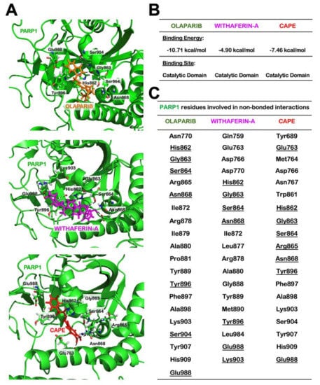 Molecular docking showing interactions of Withaferin A (Wi-A), caffeic acid phenethyl ester (CAPE), and Olaparib with poly ADP-ribose polymerase1 (PARP1). Wi-A and CAPE docked to PARP1 at the cavity lined by the catalytically active residues of PARP1, which was similar to the binding of Olaparib to PARP1 (A). Calculated binding energies and (B) details of PARP1 residues involved in non-bonded interactions (C).