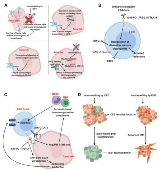 Overview of major mechanisms causing acquired resistance to immune checkpoint blockade therapy. Response to immune checkpoint blockade therapy (ICBT) is tightly controlled. The current literature has revealed several potential mechanisms contributing to acquired ICBT resistance. Panel (A), upper left: selective elimination of tumor cells with immunogenic neoantigens; upper right: loss of neoantigens due to chromosomal region deletion; lower left: loss of neoantigens due to transcriptional silencing; lower right: dysfunction of antigen processing and presentation. Panel (B): alternative immune checkpoints expression induced by ICBT. Panel (C): the coupling of tumor cell pathways stimulated by ICBT, such as adenosine production and PTEN loss, with the function of T cells. Panel (D): the transformation of tumor histological types and tumor cell epithelial–mesenchymal transition (EMT) after ICBT treatment. Abbreviations: MHC: major histocompatibility complex; PD-1: programmed cell death protein 1; PD-L1: programmed death-ligand 1; CTLA-4: cytotoxic T-lymphocyte-associated protein 4; TIM-3: T-cell immunoglobulin and mucin-domain containing-3; LAG-3: lymphocyte-activation gene 3; TIGIT: T-cell immunoreceptor with Ig and ITIM domains; MDSC: myeloid-derived suppressive cell; Treg: regulatory T-cell; A2AR: adenosine A2A receptor; A2BR: adenosine 2b receptor.