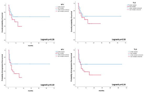 Kaplan–Meier plot analysis for MTV and TLG with both progression free survival (PFS) and overall survival (OS). Population was grouped by the median value of MTV (74.1) and TLG (310.8).