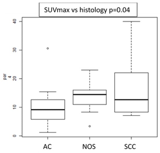 Histological variants: the only feature associated with different histological subtypes was SUVmax (Figure 2). Namely, SCC showed higher SUVmax values than AC and NOS subtype.