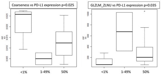 PD-L1 expression: several features (including SUVmax, volume, busyness, coarseness, GLZML_ZLNU and GLZML_GLNU) resulted in being significantly different between patients with PD-L1 expression lower than 1%, between 1% and 49% and higher than 50%. Considering the semi-automatic ROIs, only two features (coarseness and GLZLM_ZLNU) maintained the statistical correlation (Figure 3).