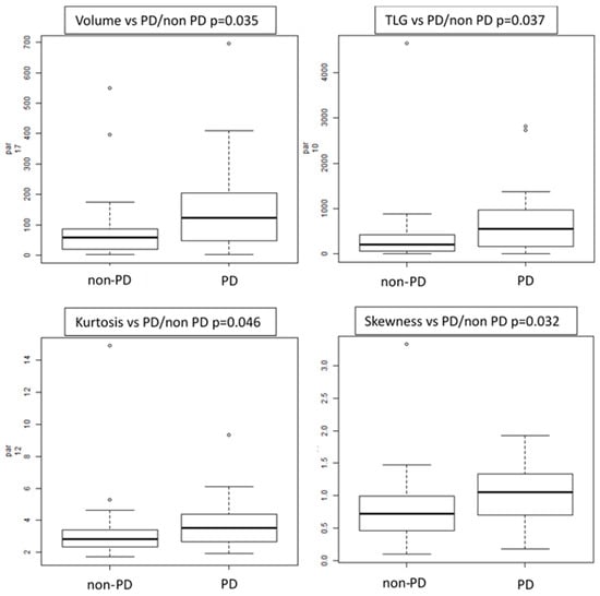 Progression status: several features showed differences between PD vs. non-PD patients, such as volume (p = 0.035), TLG (p = 0.037), three first-order histograms-based features (kurtosis, excess-kurtosis and skewness) and six textural features (GLZLM_LZE, GLRLM_RP, GLRLM_SRE, GLRLM_HGRE, GLRLM_SRHGE and GLCM Homogeneity) (Figure 4). GLZLM represents the grey-level zone length matrix and provides information on the size of homogeneous zones for each grey-level in 3 dimensions. GLZLM_LZE is the distribution of long homogeneous zones in an image. GLRLM represents the size of homogeneous runs for each grey level. “Run” means the presence of elements in the image with the same gray-level on in a row/line. GLCM_homogeneity considers the arrangements of pairs of voxels to calculate textural indices and represents the homogeneity of grey-level voxel pairs.