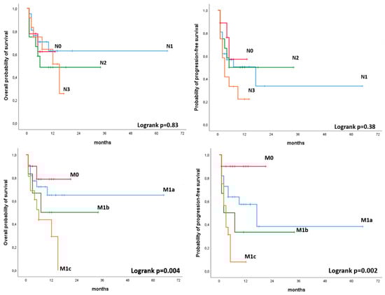 In the Kaplan–Meier plot analysis, M status (M0, M1a, M1b, M1c) as assessed by 18F-FDG PET/CT was significantly associated with PFS (p = 0.002) and OS (p = 0.049). Namely, patients with no visible metastases at PET/CT had significantly better outcome compared with those patients presenting with FDG avid metastases. No significant associations were observed for N status (N0, N1, N2, N3) as assessed by 18F-FDG PET/CT and PFS or OS. (Figure 5).