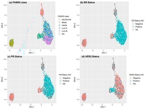 Figure 1 shows uniform manifold approximation and projection (UMAP) plots [40] for receptor status in The Cancer Genome Atlas Breast Invasive Carcinoma (TCGA BRCA) cohort. Each point represents a sample; the color of the spots corresponds to the (a) subtype (PAM50 class), (b) ER status, (c) PR status, and (d) HER2 status of the sample. Receptor status (ER, PR, or HER2) was provided in the original clinical data based on IHC. The expression of 100 genes selected by LASSO was used to obtain the two-dimensional UMAP projection. The luminal A and B subtypes were mostly HER2- and either ER+ or PR+. However, a small percentage of the luminal A and B subtypes exhibited ER-, PR-, and HER2+. Some patients with HER2-enriched or basal-like subtype breast cancer also showed some level of discordance, as some HER2-enriched and basal-like subtype samples were ER+ or PR+. Although most HER2+ and HER2-enriched subtype samples overlapped, some HER2-enriched subtype samples were found to be HER2-breast cancer that exhibited basal-like subtype features. As only eight patients exhibited normal breast-like breast cancer in the TCGA dataset, they were not considered in our analyses.