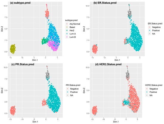 Figure 2 shows the same UMAP plot based on the predicted values obtained by the linear classifiers. Compared with IHC-based receptor-status characterization, the predicted status was more consistent with the intrinsic breast cancer subtype classification, especially for the basal-like and luminal subtypes. Most of the luminal subtypes were ER+ and PR+, and the numbers of ER+ or PR+ samples in the basal-like subtype were much smaller than after IHC-based status characterization. The UMAP plot for the METABRIC dataset based on the predicted receptor status (Figure S2) led to the same conclusions, except for PR status, which was not IHC-based in the METABRIC dataset.
