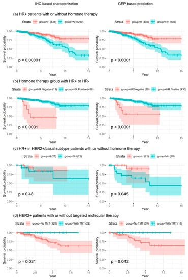 Among patients in the TCGA BRCA cohort, GEP-based receptor-status prediction provided a higher hazard ratio with higher significance in HR– patients (a), implying that GEP-based receptor-status prediction had higher prognostic value than traditional IHC-based HR status characterization. On the other hand, in the hormone-therapy group (b), IHC-based receptor-status characterization was found to be more accurate than GEP-based receptor-status prediction. However, the numbers of samples in the test group (HR-patients) were only 11 and 19 for receptor-status characterization based on IHC and GEP, respectively. Among patients with HR+ non-luminal subtype breast cancer (c), IHC-based receptor status had no significant prognostic value, in contrast to GEP-based receptor-status prediction. This finding highlighted that HR+ breast cancer patients benefited from hormone therapy, even if they were diagnosed with non-luminal subtype tumors. Among HER2+ patients (d), IHC-based receptor-status characterization exhibited higher prognostic value when considering only the p-value. However, the numbers of patients with IHC-based receptor-status data in the test group (HER2+ patients with TMT) were only 22 and 18 based on IHC and GEP, respectively, and all patients that received TMT survived; hence, the hazard ratio could not be precisely determined (Figure 3 and Table 3). The small differences between p values shown in Figure 3b,d may have been caused by the very small target sample sizes, whereas that shown in Figure 3a is likely meaningful, since the sample sizes were large (control group, ~430; test group, 300). The difference between p values shown in Figure 3c was sufficiently large to conclude that the GEP-based status was more accurate than the IHC-based status, regardless of the small sample size. Survival analyses in the METABRIC cohort (excluding patients with a pathological stage of I) showed similar findings, implying that GEP-based receptor-status prediction had higher prognostic significance in terms of patient survival compared to traditional IHC-based receptor-status characterization (Figure 4 and Table 3).