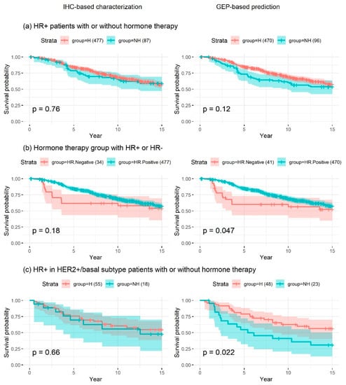 - HR+ (either ER+ or PR+) group: this group benefited from hormone therapy. According to the stage and clinical characteristics, these patients often received a combination of hormone therapy and chemotherapy. For survival analysis, the patients in this group were stratified based on administration of hormone therapy.