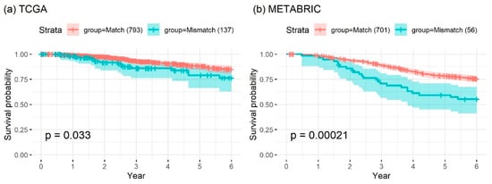 Kaplan–Meier survival analysis of patients in the (a) TCGA BRCA cohort and (b) METABRIC dataset with matching and non-matching receptor status. The hazard ratios of patients with non-matching status were 0.6 for the TCGA BRCA cohort and 0.79 for the METABRIC dataset.