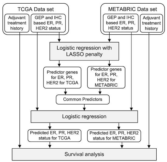 The theoretical basis for using GEP to improve predictions of hormone receptor status (i.e., ESR1, PGR, and ERBB2 gene expression statuses) is that other genes have highly correlated expression levels that indirectly reflect the expression levels of the target genes. Although the measured expression levels of these genes contain independent noise, this noise may be reduced according to the correlation between relevant genes and their expression levels. Several machine learning techniques can be applied for this purpose, e.g., extreme gradient boost (XGB) [47] or support vector machine (SVM) [48] methods. In this study, we used logistic regression with a LASSO penalty; this approach is suitable for the prediction of hormone receptor status as well as the selection of co-expressed predictor genes. The workflow of this study is shown in Figure 6. Our analyses were performed in three steps. First, we identified common predictor genes from two different gene-expression datasets. Second, we predicted ER, PR, and HER2 status based on the shared predictor genes. Finally, we compared survival outcomes according to IHC-based and GEP-based predictions of receptor status.