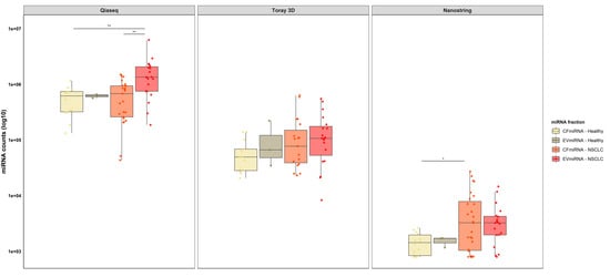Box plot analysis (Figure 1) shows the total read numbers in different miRNA fractions for each platform. QIAseq revealed the highest miRNA counts in all miRNA fractions compared to the hybridization platforms. Moreover, the QIAseq showed significantly (p < 0.01) higher read numbers in EVmiRNA of NSCLC patients compared to the cfmiRNA fraction of healthy controls and NSCLC patients. With the nCounter, we are able to show significantly (p< 0.05) higher read numbers in the cfmiRNA fraction, extracted from NSCLC patients, compared to healthy control samples. In more detail, sequencing of miRNA extracted from healthy individuals resulted in a mean of 5.66E+05 (± 3.01E + 05) and 6.20E + 05 (± 5.03E + 04) reads for cfmiRNA and EVmiRNA, respectively, while NSCLC patients showed a mean of 6.56E + 05 (± 4.41E + 05) for the cfmiRNA and 1.63E + 06 (± 1.36E + 06) for EVmiRNA fraction. Moreover, both Toray 3D and nCounter showed slightly higher mean miRNA counts in NSCLC patients (Toray 3D: 1.46E + 05 (± 1.78E + 05) and 1.58E + 05 (± 1.54E + 05) for the cfmiRNA and the EVmiRNA fraction, respectively; nCounter: 6.18E + 03 (± 7.32E + 03) and 4.05E + 03 (± 3.66E + 03) for the cfmiRNA and the EVmiRNA fraction, respectively) compared to healthy individuals (Toray 3D: 6.03E + 04 (± 4.13E + 04) and 1.08E + 05 (± 1.00E + 05) for the cfmiRNA and the EVmiRNA fraction, respectively; nCounter: 1.48E + 03 (± 6.49E + 02) and 1.54E + 03 (± 3.17E + 02) for the cfmiRNA, and the EVmiRNA fraction, respectively).