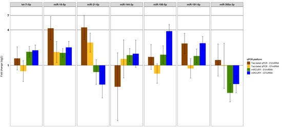 Next, we performed a global normalization by subtracting the mean Cq-value of all miRNAs in a given sample per each platform and miRNA fraction. In addition, we calculated and compared the fold change (2-∆∆Cq) between lung cancer patients and control samples (Figure 2). About 32% (7 of 22) of selected miRNAs were detected by both platforms showing a different regulation trend for some candidate miRNAs. While only miR-16-5p was upregulated in cfmiRNA and EVmiRNA shown by miRCURY and two-tailed qPCR, especially two-tailed qPCR showed a divergent regulation between the cfmiRNA and EVmiRNA fractions (either down-or upregulation). Of interest, miR-21 was shown to be upregulated in the two-tailed qPCR and downregulated in the miRCURY platform.
