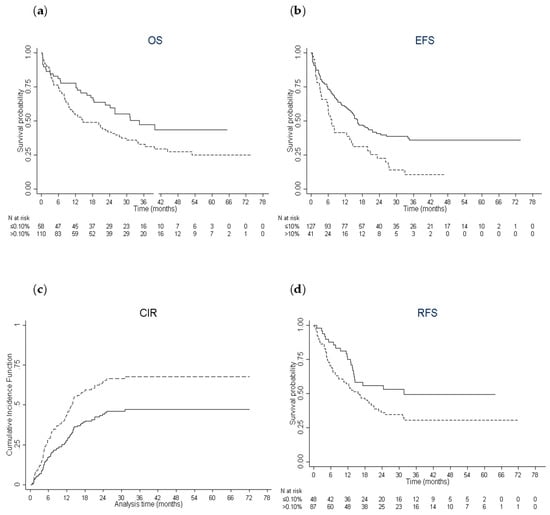 Estimates of survival end points and incidence of relapse. (a) Kaplan–Meier curves for overall survival according to the leukemic stem frequency (CD34+CD38−CD123+ % ≤0.10%: solid line; >0.10%: dashed line) in patients treated by intensive chemotherapy. (b) Kaplan–Meier curves for event-free survival (CD34+CD38−CD123+ % ≤10%: solid line; >10%: dashed line). (c) Cumulative incidence of relapse (CD34+CD38−CD123+ % ≤10%: solid line; >10%: dashed line). (d) Kaplan–Meier curves for relapse-free survival (CD34+CD38−CD123+ % ≤0.10%: solid line; >0.10%: dashed line).