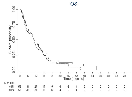 Kaplan–Meier curves for overall survival according to the leukemic stem frequency in patients treated by hypomethylating agents (CD34+CD38−CD123+ % ≤8%: solid line; >8%: dashed line).