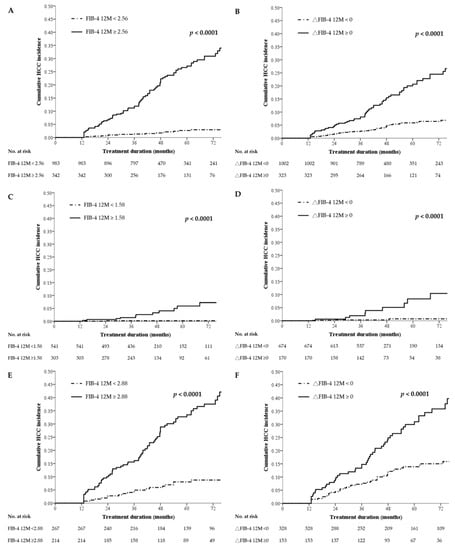 For the entire cohort, a combination of FIB-4 12M and △FIB-4 could stratify the cumulative risk of HCC into four subgroups (p < 0.0001 by the log-rank test). Among them, 135 with FIB-4 12M ≥ 2.56 and △FIB-4 ≥ 0 exhibited the highest risk of HCC (HR: 25.58, 95% CI: 13.31–49.15, p < 0.0001), and 795 with FIB-4 12M < 2.56 and △FIB-4 < 0 exhibited the lowest risk of HCC (HR: 1 as reference) (Table 5, Figure 2A. A combination of FIB-4 12M and △FIB-4 was used to stratify the cumulative risk of HCC into three subgroups in the noncirrhotic and cirrhotic subgroups (each subgroup p < 0.0001 by the log-rank test). Among the noncirrhotic patients, 88 with FIB-4 12M ≥ 1.58 and △FIB-4 ≥ 0 exhibited the highest risk of HCC (HR: 40.35, 95% CI: 5.107–318.7, p < 0.0001), and 459 with FIB-4 12M < 1.58 and △FIB-4 < 0 exhibited the lowest risk of HCC (HR: 1 as reference) (Table 5, Figure 2B). Among the cirrhotic patients, 89 with FIB-4 12M ≥ 2.88 and △FIB-4 ≥ 0 exhibited the highest risk of HCC (HR: 9.576, 95% CI: 5.033–18.22, p < 0.0001), and 203 with FIB-4 12M < 2.88 and △FIB-4 < 0 exhibited the lowest risk of HCC (HR: 1 as reference) (Table 5, Figure 2C).