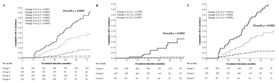 2.4. Cumulative Incidence of HCC Stratified by 1-Year FIB-4 Values or On-Treatment Changes in FIB-4