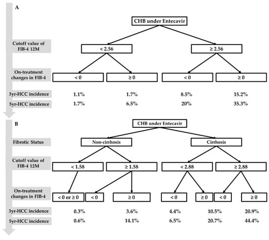 Group 4, FIB-4 12M ≥ 2.56 and △FIB-4 ≥ 0; (B) noncirrhotic patients treated with entecavir ≥ 3 years: