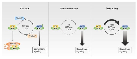 For most Rho GTPases, including the Rho, Rac, and Cdc42 subfamilies, GDP/GTP cycling is regulated by RhoGEFs and RhoGAPs. However, there are atypical Rho family members that are activated via another mechanism. For example, the Rnd (Rnd1–3) and RhoBTB (RhoBTB1–3) subfamilies have amino acid substitutions in their GTPase domain that are not recognized by RhoGAPs, and thus, their GTP hydrolysis rate cannot be accelerated by these proteins. These subfamily members are thus constitutively active and GTP-bound, although they have intact GDP/GTP nucleotide exchange activity [14,15]. Similarly, RhoH has defective GTPase activity and is unable to hydrolyze GTP, and therefore is presumed to be constitutively active [16]. The RhoU/RhoV and RhoD/RhoF subfamilies represent another type of atypical Rho GTPases. These family members have high intrinsic guanine nucleotide exchange activity, and are assumed to be mostly GTP-bound in cells [17,18]. Because these atypical Rho GTPases also have GTPase activity and can cycle between GDP-bound and GTP-bound forms, they are considered to be the fast-cycling Rho GTPases [6,19,20].