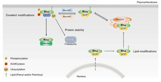 Rho GTPases are regulated by various PTMs, including lipid modifications, phosphorylation, ubiquitination, and sumoylation (Figure 2). These modifications modulate their activity and protein levels, and are linked to anomalous Rho GTPase signaling in human cancers (Table 1).