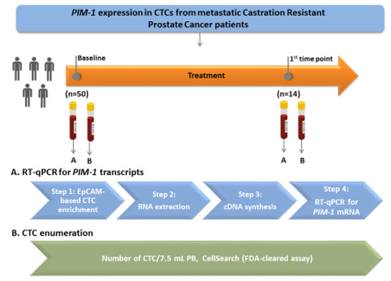 In this study, we first developed and validated a highly sensitive RT-qPCR assay for quantification of PIM-1 transcripts and reported for the first time that PIM-1 is overexpressed in EpCAM(+) CTC fraction isolated from mCRPC patients. We further evaluated whether PIM-1 overexpression in EpCAM(+) CTC fraction is correlated with ARV7 expression in the same samples. Our data indicate that PIM-1 overexpression in CTCs should be prospectively evaluated as a potential biomarker for prostate cancer management in a large and well-defined patient cohort.