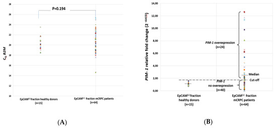 (A) Cq values for B2M and (B) relative fold change for PIM-1 in the EpCAM(+) fraction in healthy donors (HD) (n = 15) and metastatic castration-resistant prostate cancer (mCRPC) patients samples (n = 64).