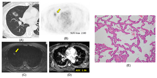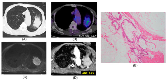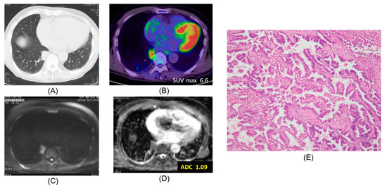 Lepidic adenocarcinoma. The ADC of the carcinoma was 1.36 × 10−3 mm2/s. (A) CT, (B) PET-CT, (C) DWI, (D) ADC map, (E) Pathology (Hematoxylin and Eosin Staining) ×100.