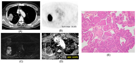 Papillary adenocarcinoma. The ADC of the carcinoma was 1.09 × 10−3 mm2/s. (A) CT, (B) PET-CT, (C) DWI, (D) ADC map, (E) Pathology (Hematoxylin and Eosin Staining) ×100.