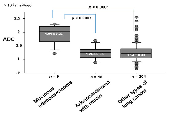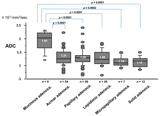 The ADC value by pathologic subtype of adenocarcinoma is shown in Figure 6. The ADC value (1.91 ± 0.36 × 10−3 mm2/s) of mucinous adenocarcinoma was significantly higher than that (1.31 ± 0.28 × 10−3 mm2/s) of acinar adenocarcinoma (p < 0.0001), (1.29 ± 0.30 × 10−3 mm2/s) of papillary adenocarcinoma (p < 0.0001), (1.28 ± 0.28 × 10−3 mm2/s) of lepidic adenocarcinoma (p < 0.0001), (1.14 ± 0.20 × 10−3 mm2/s) of micropapillary adenocarcinoma (p = 0.0002), or (1.12 ± 0.20 × 10−3 mm2/s) of solid adenocarcinoma (p < 0.0001).