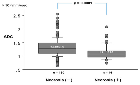 The ADC value (1.91 ± 0.36 × 10−3 mm2/s) of mucinous adenocarcinoma was significantly higher than that (1.25 ± 0.25 × 10−3 mm2/s) of adenocarcinoma with mucin, or (1.24 ± 0.30 × 10−3 mm2/s) of other cell types (Figure 7). The ADC (1.11 ± 0.26 × 10−3 mm2/s) of lung cancer with necrosis was significantly lower than that (1.32 ± 0.33 × 10−3 mm2/s) of lung cancer without necrosis (p = 0.0001) (Figure 8). For cell differentiation, the ADC value was 1.36 ± 0.35 × 10−3 mm2/s in well differentiation (G1), 1.24 ± 0.28 × 10−3 mm2/s in moderate differentiation (G2), 1.12 ± 0.19 × 10−3 mm2/s in poor differentiation (G3), and 1.18 ± 0.43 × 10−3 mm2/s in undifferentiation (G4). There is a correlation between the decrease in ADC value and the decrease in cell differentiation.