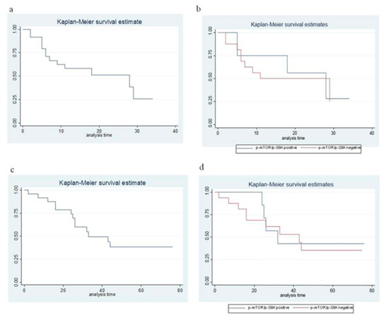 Progression-free and overall survival in the whole series (a,c) and according to p-mTOR/p-S6K expression (b,d).