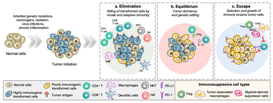 Figure 1. Cancer immunoediting concept–the dual host-protecting and tumor-sculpting actions of the immune system proposed by Dunn et al. [24]. Oncogenic stimuli cause normal cells to undergo transformation and become tumorigenic. Transformed cells are recognized and eradicated by the innate and adaptive immune systems during the elimination phase. In the equilibrium phase, surviving tumor cells continue to adapt to the constant anti-tumor immune pressure. The escape phase is largely associated with the outgrowth of immunoedited tumor cells capable of evading the immune systems through various means; loss of immunogenicity, loss of antigenicity, and/or orchestrating an immunosuppressive microenvironment (i.e., recruitment of immunosuppressive cell types such as regulatory T cells (Treg), tumor-associated macrophages (TAM), and myeloid-derived suppressor cells (MDSC)).
