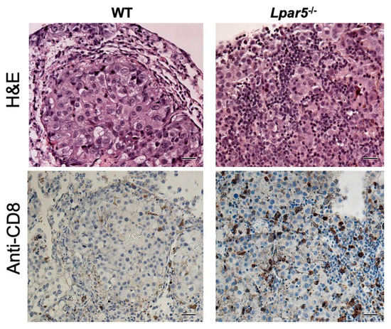 Figure 2. Increased infiltration of CD8+ T cells in lungs of Lpar5−/− mice compared to wild type mice (WT). In the few Lpar5/− mice (n = 3 out of 12 mice) that had low numbers of metastatic tumors, higher incidence of lymphocyte infiltration was observed and positively stained for CD8. No or lesser lymphocyte infiltration was seen in wild type littermates. Scale bar (50 µm), 200× magnification.