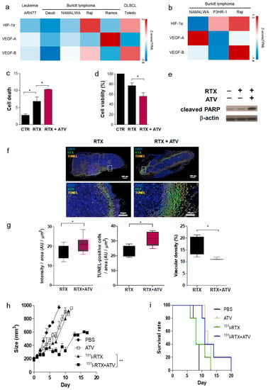 Atorvastatin (ATV) improved therapeutic effect of 131I-RTX in Raji cells. (a) Public RNAseq database, Expression ATLAS (EMBL-EBI, http://www.ebi.ac.uk/gxa). Expression ATLAS provided several immortalized B cell lines Project 6 of Open Targets—Epigenomes of Cell Lines. (b) RNAseq of 934 human cancer cell lines from the Cancer Cell Line Encyclopedia. (c, d) The apoptosis rate and cell viability were assessed by FACS analysis and trypan blue assay after atorvastatin (ATV) or ATV+ rituximab (RTX) treatment. (e) Apoptosis was confirmed by western blotting of cleaved PARP. Raji cell lysates are shown with the corresponding antibodies. (f) Fluorescence image of Alexa488- rituximab (RTX) was acquired using an In Cell Analyzer on a whole tumor tissue. Representative images of tumor tissue after treatment with Alexa488-RTX alone and combination with Alexa488-RTX and atorvastatin (ATV). Alexa488-rituximab (green), TUNEL-positive cell (yellow), and DAPI staining (blue). The lower row is an enlarged image of the white box in the upper row. (g) The accumulation of Alexa-488-RTX per tumor tissue area with or without ATV was quantified with TUNEL-positive cells per tumor tissue area, and the vascular density of RTX with or without ATV was quantified (*p < 0.05). (h) Tumor volume changes were measured in mice treated with PBS, 131I-RTX, ATV, and ATV plus 131I-RTX. The tumor volumes were calculated every other day for 20 days. (**p < 0.005). (i) Survival rates of each group.