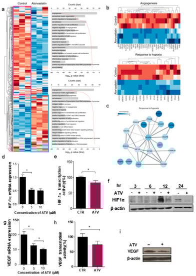 Atorvastatin suppresses HIF-1α and VEGF, leading to reduced tumor angiogenic activity in atorvastatin-treated cells. (a) NanoString analysis and unsupervised algorithms. Using 718 probe set with highest variable gene expression, two clusters of co-expressed genes were defined using hierarchical clustering. (b) Two clusters of co-expressed genes for angiogenesis and response to hypoxia. (c) String network analysis for response to hypoxia. HIF-1α, VEGF A, and VEGF B were highly correlated. (d) mRNA level of HIF-1α by qRT-PCR. qRT-PCR revealed that ATV attenuated the mRNA levels of HIF-1α in ATV-treated Raji cells. (e) Transcriptional activity of HIF-1α in ATV-treated cells. (f) HIF-1α protein level by western blotting. mRNA and protein level of HIF-1α, and transcriptional activity of HIF-1α also decreased in ATV-treated cells. The mRNA level of HIF-1α by qRT-PCR (g) The mRNA level of VEGF by qRT-PCR. qRT-PCR revealed that ATV attenuated the mRNA levels of VEGF in ATV-treated Raji cells. (h) Transcriptional activity of VEGF. (i) VEGF protein level by western blotting. The mRNA and protein level of VEGF, and transcriptional activity of VEGF were also decreased in ATV-treated cells.