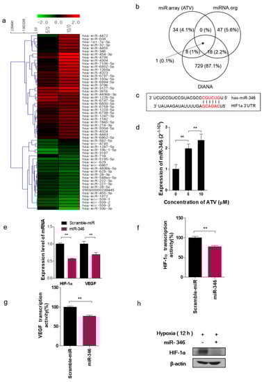 Target relationship between miR-346 and HIF-1a in the Raji cells. (a) Hierarchical clustering of miRNA expression reveals a descending ordered list of significant miRNA clusters in the untreated control cells. (b) Venn diagram presenting the number of putative miRNA candidates by two prediction programs and microRNA microarray. (c) The sequence alignment of miR-346 with the 3′UTR of HIF-1α gene was searched in the miRNA database. (d) The relative expression of miR-346 in Raji cells was analyzed according to the concentration of ATV via qRT-PCR (**p < 0.005). (e) The mRNA expression of HIF-1α and VEGF was measured by using qRT-PCR after miR-346 treatment in Raji cells. (f) The level of HIF-1α determined by ELISA after miR-346 transfection (**p < 0.005). (g) The level of VEGF determined by ELISA after miR-346 transfection (**p < 0.005). (h) The protein expression of HIF-1α determined by western blotting in hypoxia-induced-Raji cells.