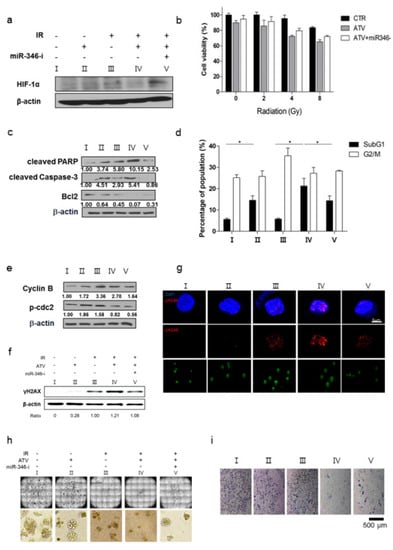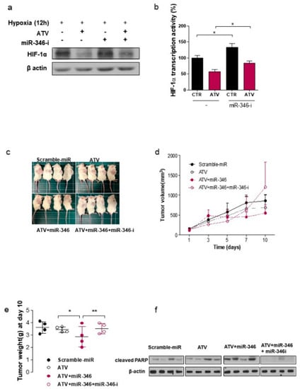 The miR-346 mimics, control mimics, miR-346 inhibitors, and control inhibitors were all purchased from Bioneer (Daejeon, Korea). In vivo-jetPEI®in vivo DNA and siRNA delivery reagent was purchased from Polyplus-transfection® SA (Polyplus, New York, NY) and lipofectamine (Thermo Fishers Scientific, Eugene, OR, USA). The primary antibodies used for western blot analyses were obtained as follows: Anti-HIF1alpha (BD Transduction Laboratories, San Jose, CA, USA); anti-VEGF, anti-cyclin B, anti-β-actin (Santa Cruz Biotechnology, Dallas, TX, USA); anti-cleaved PARP, anti-caspase-3, anti-p-cdc2 (Cell Signaling Technology Danvers, MA, USA); and anti-γ- H2AX (Millipore, Billerica, MA, USA). ATV was purchased from Sigma-Aldrich (St. Louis, MO, USA).