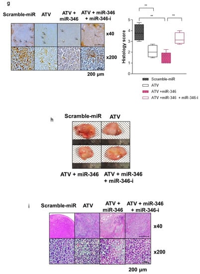 Therapy was started when the tumor volume reached ~200 mm3. The tumor-bearing mice were randomly assigned to four groups (n = 5 each): (1) control mice receiving intraperitoneal (i.p.) injection of 100 μL PBS and intratumoral injection of 5 μg miRNA negative mimic; (2) mice receiving i.p. intratumoral injection of 5 μg has-miR-346 mimic; (3) mice receiving orally administered ATV (12 μg/day in PBS) and intratumoral injection of 5 μg has-miR-346 mimic; (4) mice receiving ATV (12 μg/day in PBS), intratumoral injection of 5 μg has-miR-346 mimic, and intratumoral injection of 5 μg has-miR-346 inhibitor. For in vivo administration of miRNA mimic, the negative control or miR-346 mimic was complexed with in vivo-JetPEI at an N/P ratio of 6 in 5% glucose solution (a total of 20 μL) for intratumoral injection. The mice were treated twice a week.
