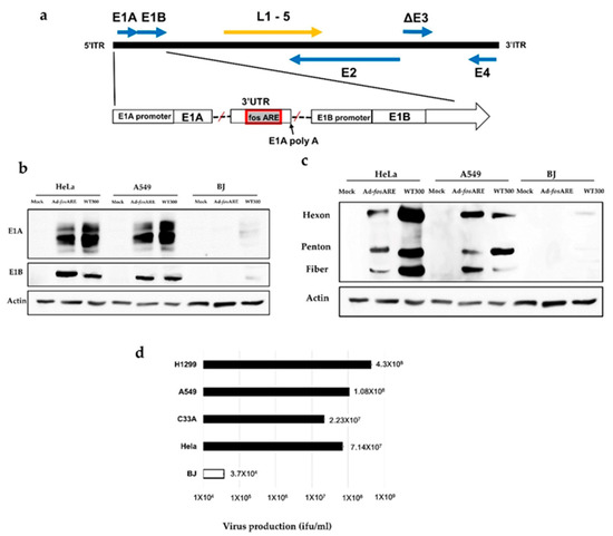 Viral therapy based on conditionally replicating adenoviruses (CRAds) is a promising cancer therapeutic strategy, as these viruses selectively replicate and lyse cancer cells [1,2]. CRAds are obtained by either modifying viral gene by mutation or by the insertion of cancer-specific agents [3]. We developed an adenovirus designated Ad-fosARE by inserting AU-rich elements (ARE) in the 3’-untranslated region (3′-UTR) of the E1A gene.