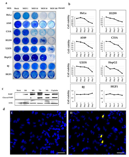 Cell lysis activity of Ad-fosARE. (a) Cancer (HeLa, A549, C33A, H1299, U2OS, and HepG2) cells and normal (BJ and HGF1) cells were infected with the virus at MOIs indicated. Cells were stained using Coomassie brilliant blue 7 days post-infection. Living cells stained blue. (b) Cell metabolic activities of Ad-fosARE-infected cells were measured to estimate the cell lysis activity using the XTT assay. The same cancer and normal cells were infected with the virus at a MOI of 100 ifu/cell and cell viabilities were estimated 1, 3, 5, and 7 days post infection. (c) Cleaved PARP levels were assessed by western blot analysis to detect the cell death activity mediated by Ad-fosARE. PARP expression in cisplatin-treated cells were used as a positive control [34]. (d) HeLa cells were infected with Ad-fosARE with MOI 100 ifu/cell. The apoptosis of cells was also analyzed by Hoechst 33,342 staining 96 h after infection. Nuclear fragmentation and chromatin clumping were observed in the virus treated cells (Yellow arrows). Scale bar: 50 µm. Three replicates represented each assay.