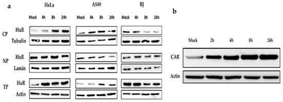 Cells were lysed with RIPA buffer (150 mM NaCl; 25 mM Tris-HCl, pH 7.6; 1%Nonidet P-40; 1% sodium deoxycholate; 0.1% SDS) containing protease inhibitors. Equal amount (20 µg) of total protein were separated by 10% sodium dodecyl sulfate-polyacrylamide gel electrophoresis (SDS-PAGE) and transferred onto polyvinylidene difluoride membranes (Millipore, Billerica, MA, USA). Fractionation buffer (10 mM Tris-HCl, pH 7.6, 150 mM NaCl, 1.5 mM MgCl2, 0.5% Nonidet P-40, protease inhibitor cocktail) was used to fractionate the cytoplasmic and nuclear proteins, followed by vigorous shaking for 5 min and centrifugation at 12,000 rpm for 30 s. The supernatant was used as the cytoplasmic protein fraction. To assess the accuracy of cell fractionation, cytoplasmic (β-tubulin), and nuclear (lamin B) proteins were detected. For detection of surface protein CAR, the protocol described in Andolazimi et al. was used [23]. Bands were visualized using SuperSignal West Femto Maximum Sensitivity Substrate (Thermo Fisher Scientific, Inc., Waltham, MA, USA). Detailed information about western blot figures can be found at Figures S5–S15.